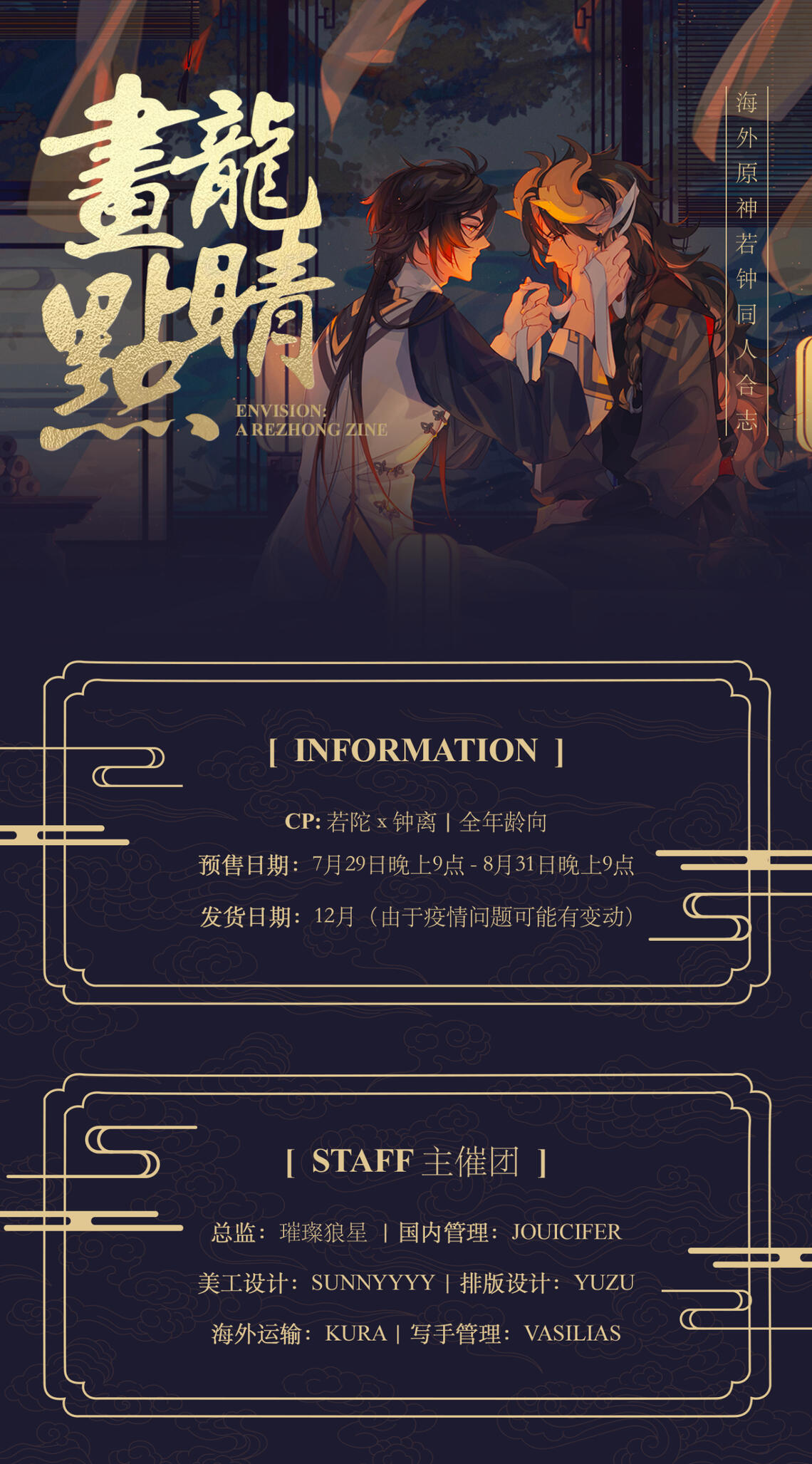 Envision is a for-profit, physical Genshin Impact fanzine celebrating the relationship between Retuo Longwang (Azhdaha) and Zhongli (Morax).Specs
